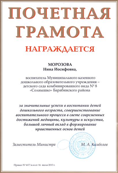 04.02.2018ПОЧЁТНАЯ ГРАМОТА Министерства образования и науки РФ за значительные успехи в воспитании детей дошкольного возраста, большой личный вклад в формирование в формирование нравственных основ детейФайл