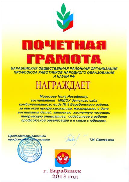 04.02.2018ПОЧЁТНАЯ ГРАМОТА Барабинской общественной районной организации профсоюза работников народного образования и науки РФ за высокий профессионализм, мастерство в деле воспитания детей, активную жизненную позицию, творческую инициативуФайл